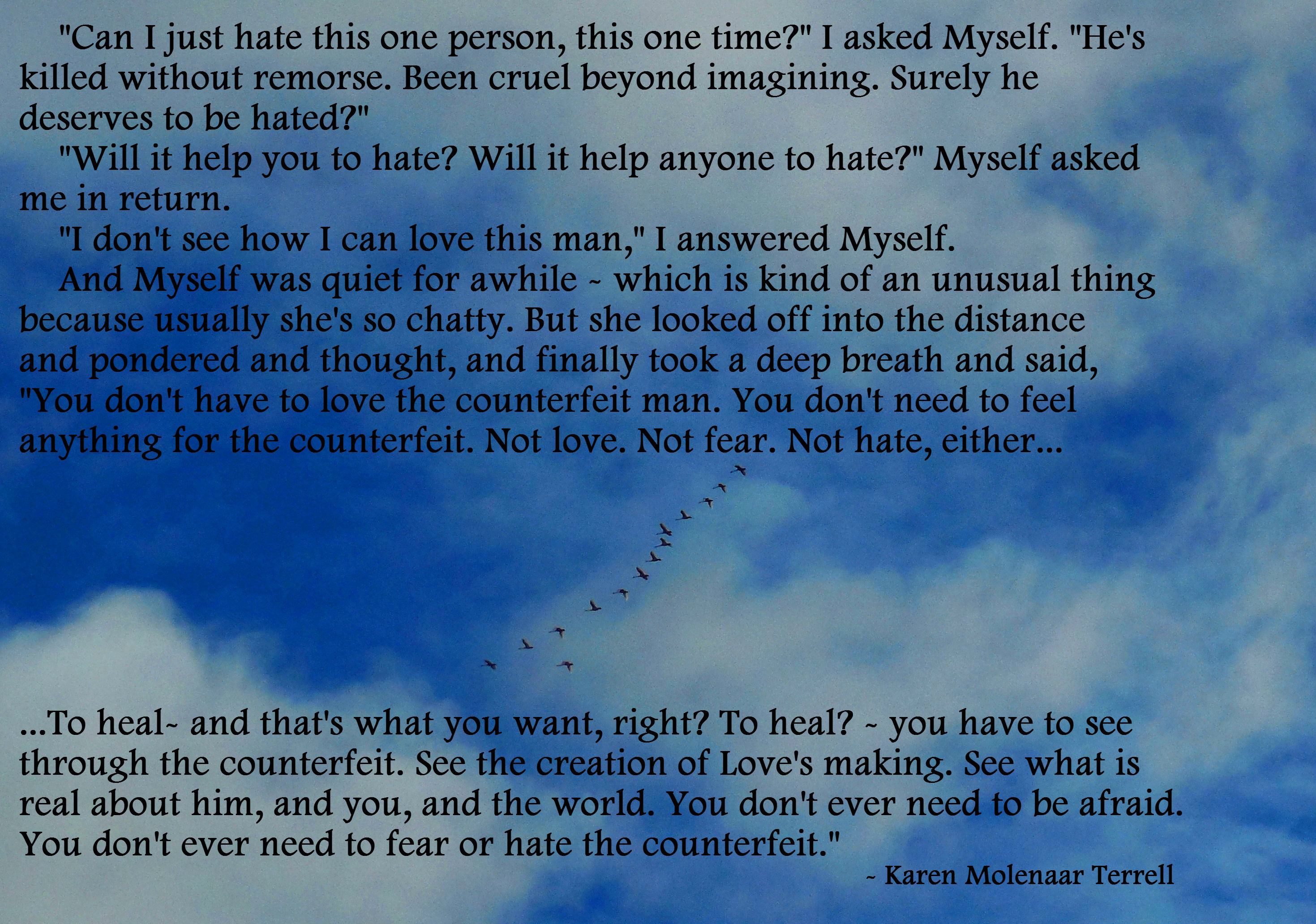Can I just hate this one person this one time? Posted on August 22, 2014 by Karen Molenaar Terrell “Can I just hate this one person this one time?” I asked Myself. “He’s killed without remorse. Been cruel beyond imagining. Surely he deserves to be hated?” “Will it help you to hate? Will it help anyone to hate?” Myself asked me in return… Share this: Click to share on X (Opens in new window) X Click to share on Facebook (Opens in new window) Facebook Click to share on LinkedIn (Opens in new window) LinkedIn Click to share on Reddit (Opens in new window) Reddit Click to share on Tumblr (Opens in new window) Tumblr Click to share on Pinterest (Opens in new window) Pinterest Like Loading... Related