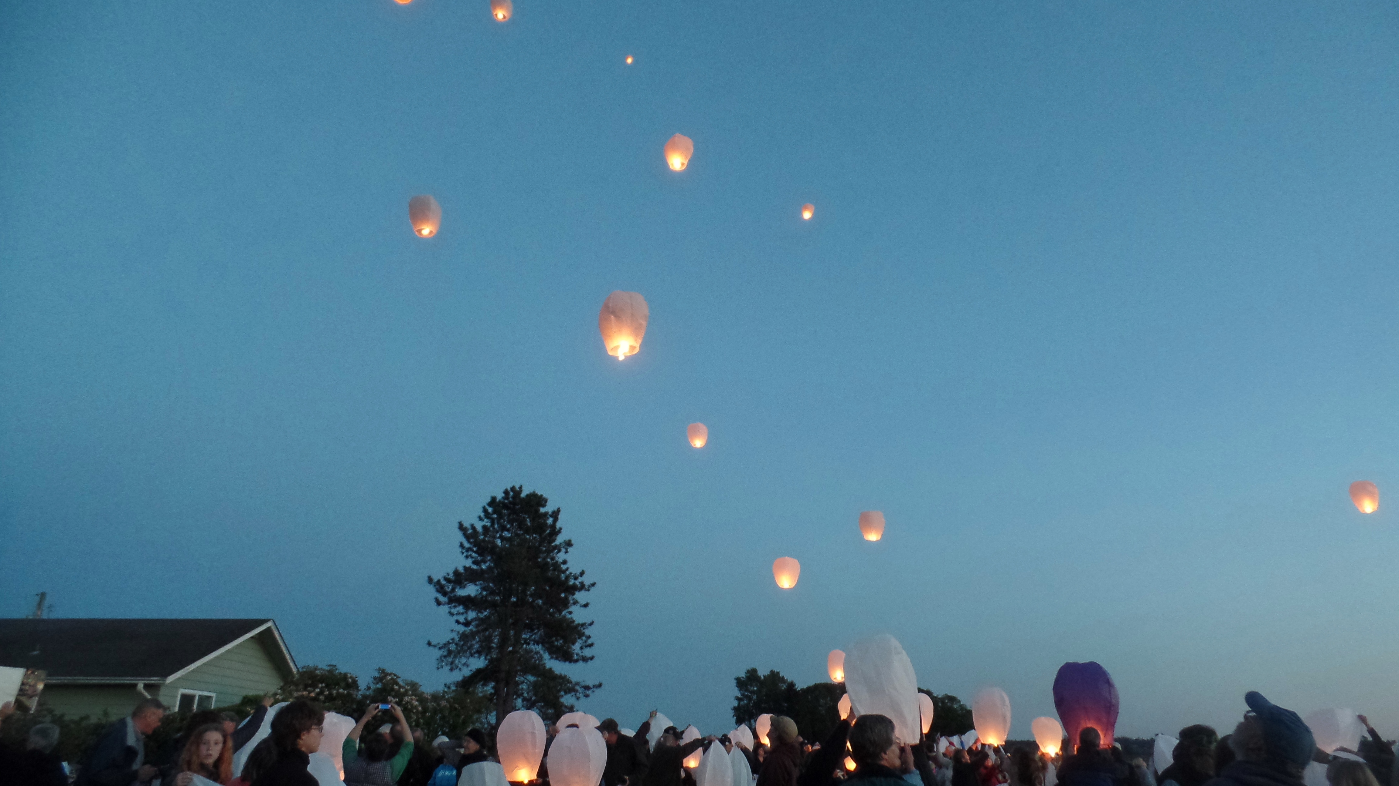 – Our neighbor and dear friend, Mike, passed away this week. Mike and his family are some of the most wonderful people you’ll ever meet – kind, funny, quirky, genuinely caring people – all of them were a huge support when I went through a personal crisis a few years ago. Before Mike passed on, his family and friends organized a sky lantern extravaganza in celebration of Mike’s amazing life. Apparently Mike had bought, like, a gazillion sky lanterns some time ago – never realizing, his wife said, that they’d be used to celebrate HIS life. And so we all met – friends, family, neighbors – in a green field in Bow to send our lanterns of love into the sky for Mike. Mike arrived just before the lanterns alighted and was able to watch the magic from the comfort of a car. It was good to see him there. Being able to celebrate Mike WITH Mike – instead of after him – was a huge blessing – a magical, teary, amazing time. I’m so glad I could be part of that.