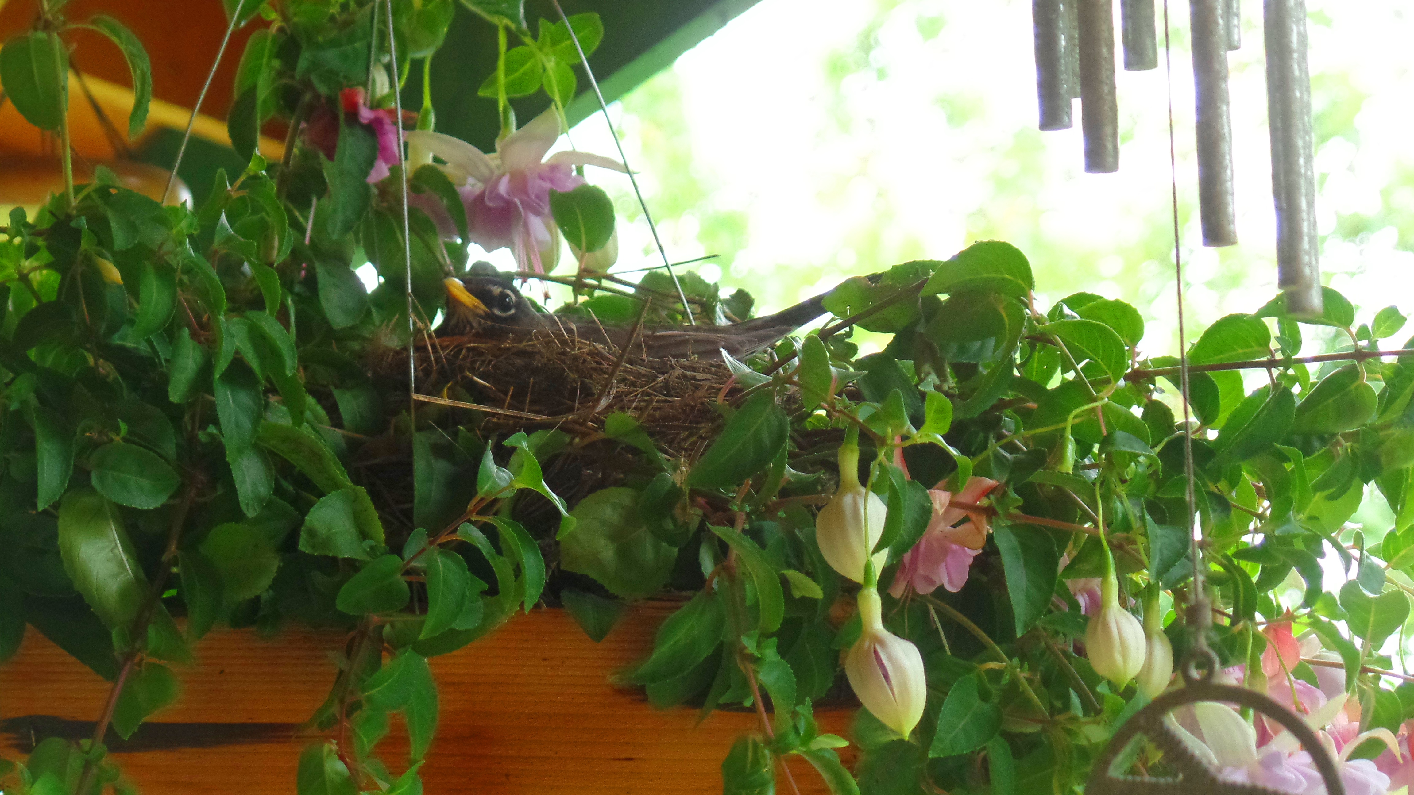 SAMSUNG CAMERA PICTURES Published June 19, 2015 at 4608 × 2592 in The Robin Family in the Hanging Fuschia June 6th (photo by Karen Molenaar Terrell)