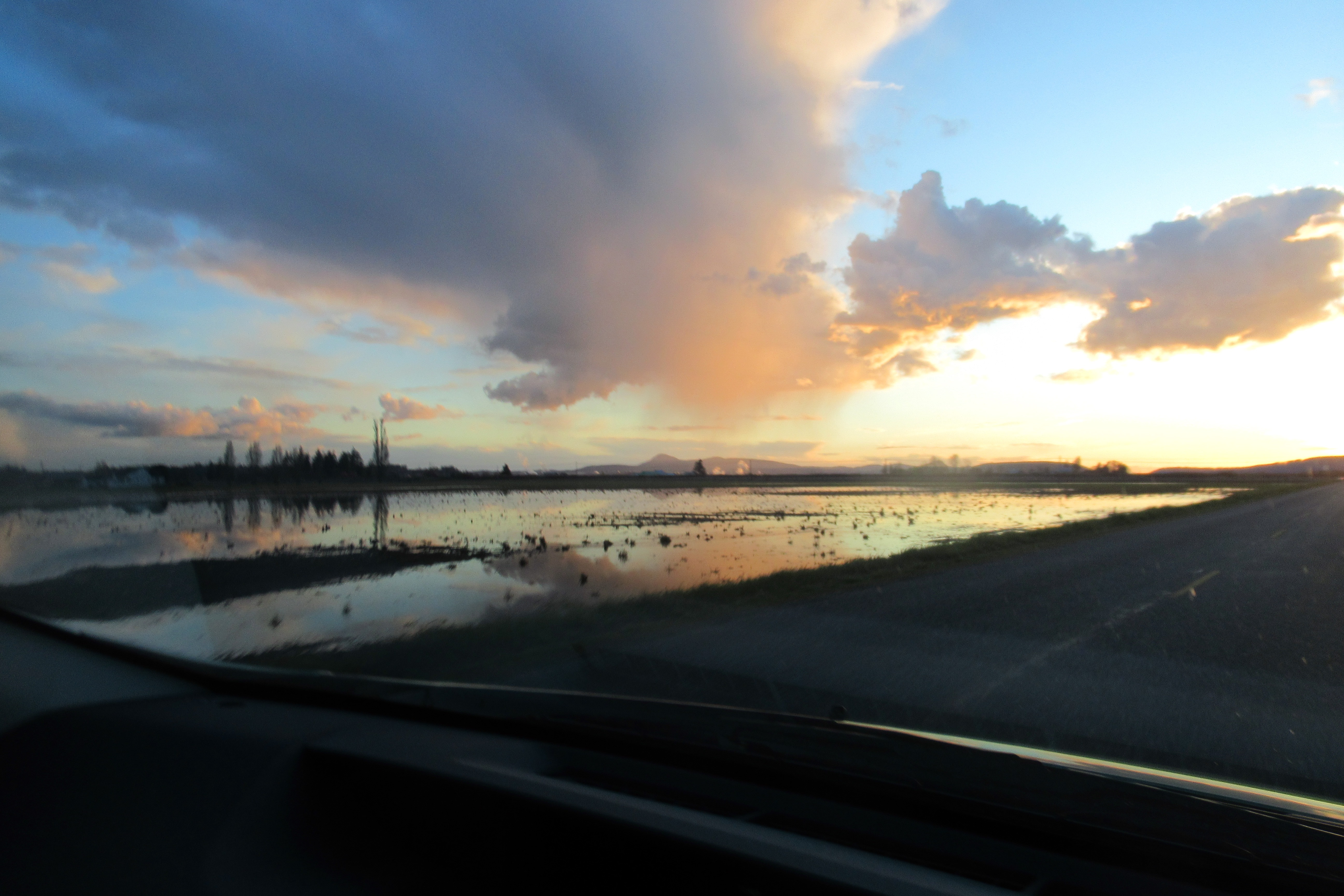 bow sunset reflection from car 2 this one Published March 25, 2018 at 5184 × 3456 in Jeweled Sky and Winging Things Flooded field, Skagit County, WA.