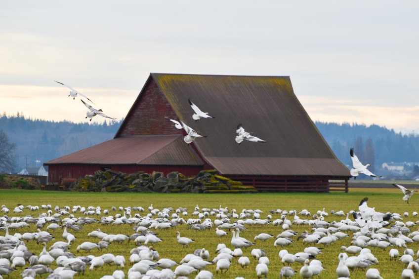 snow geese flying this one also really Published December 3, 2019 at 6000 × 4000 in Dad and I and a Flock of Snow Geese February: Snow Geese and a Red Barn in Skagit County