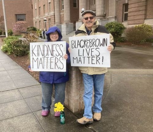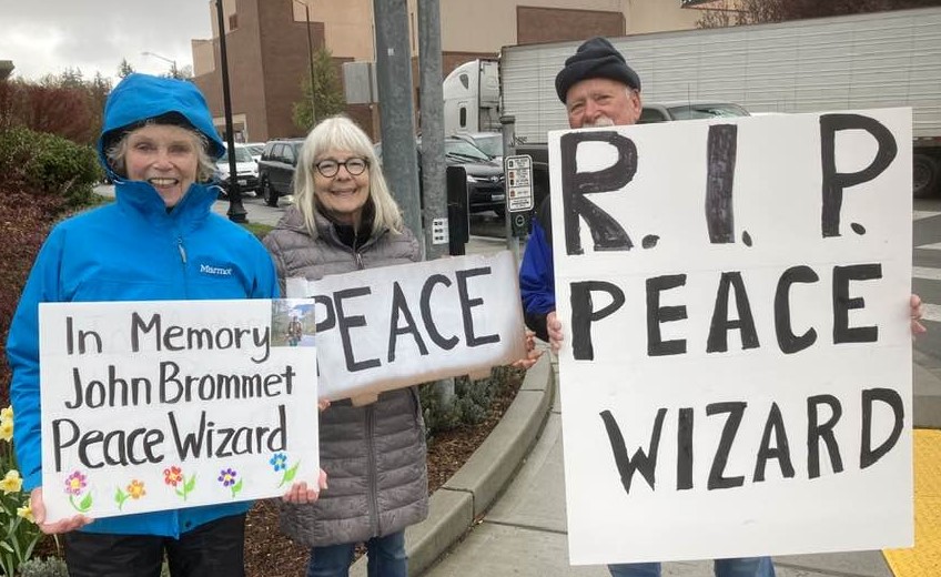 When I’d heard that my friend, John “Peace Wizard” Bromet, had passed, I immediately thought of the Friday noon vigils in front of the Skagit County Courthouse. John had been a faithful force at these vigils for decades. His passing was going to leave a huge hole there. Almost as soon as the thought came to me, I knew how I could honor John: I would go to the courthouse at noon and hold my “TRUTH JUSTICE KINDNESS” sign, and every time a car honked I would give a “high kick” like John had done.