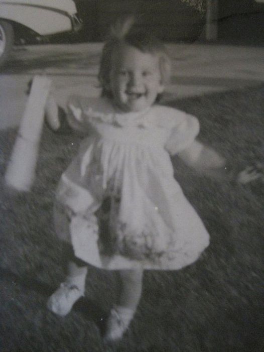 I pick her up and take her to the end of the driveway. She sees her daddy now, and her mommy standing beside him. She starts grinning. I set her down, and she race-toddles to my son – they’re both laughing. The son gets down on his haunches to welcome her into his arms, and she settles inside his hug.