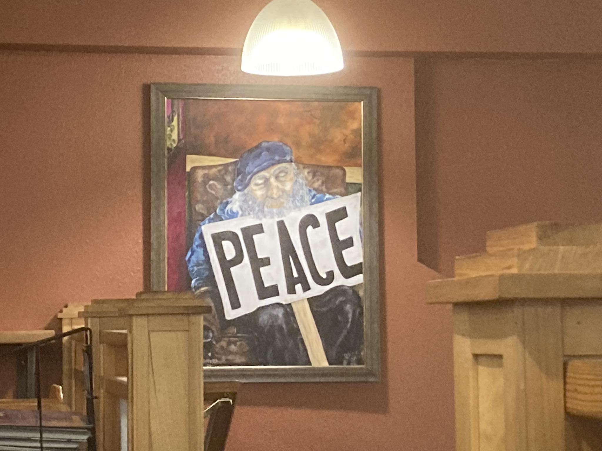 I ended up in downtown Mount Vernon. It was probably only 7:30 or so at this point, and the streets were empty and the shops closed. I wandered down the length of First Street until I found myself at the Co-op. It was open. I bought myself a mocha and a blueberry strudel and took them upstairs to a table to sit and think. I sat facing the painting of my old friend, John “Peace Wizard” Bromet, who died in 2023. And I started sobbing. Not so’s anyone could hear me or anything. But my face scrunched up and the tears rolled down my cheeks. I can’t tell you what I was feeling right then – I’m not even sure myself. I think I was feeling a sense of loss, but… I think John’s portrait also sort of bolstered me. It was like I could feel him there with me, smiling and encouraging me.
