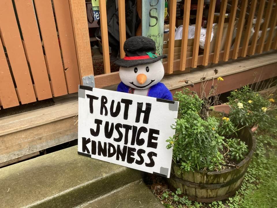 Yesterday, as I was standing on the corner in front of the courthouse with my TRUTH JUSTICE KINDNESS sign, a man who was stopped in his car at the stoplight, honked and gave me a “thumbs down.” I pointed to each word on my sign, smiling and with my eyebrows raised in question. Truth? Thumbs down. Justice? Thumbs down. Kindness? Thumbs down. And now I was laughing so hard I had tears in my eyes. What the heck?! Seriously?! What the heck?! The man holding a sign next to me started laughing, too. It was just too classic, you know? And we stood there, together, laughing at the sad ridiculousness of it all. I haven’t had such a good laugh in days. “Bless his heart,” I said, and we laughed some more.