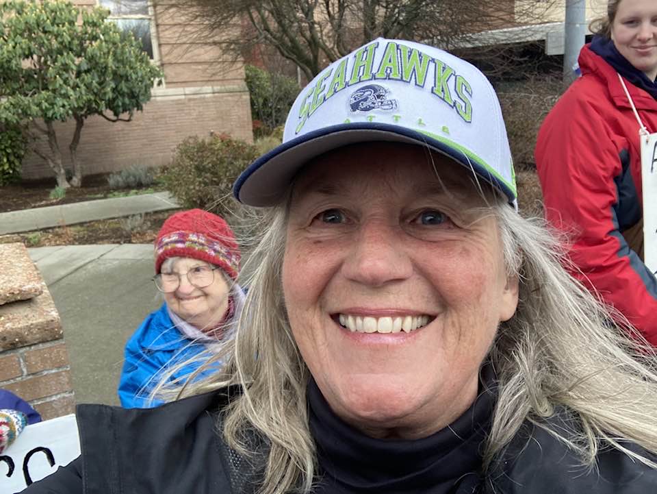 I’d come all decked out in my Seahawks paraphernalia today. This came in handy. At one point a man, stopped in front of me in his truck, gave my TRUTH JUSTICE KINDNESS sign a thumbs down. I grinned and revealed my Seahawks shirt and yelled, “Seahawks?” to him. He laughed and gave me a thumbs up . As he drove through the intersection we smiled and waved at each other. A man and woman gave me a thumbs up for my sign, and then when I showed them my Seahawks shirt they gave me a DOUBLE thumbs up. A sheriff’s deputy waved to me and gave me a thumbs up as he turned to go to the sheriff’s office.