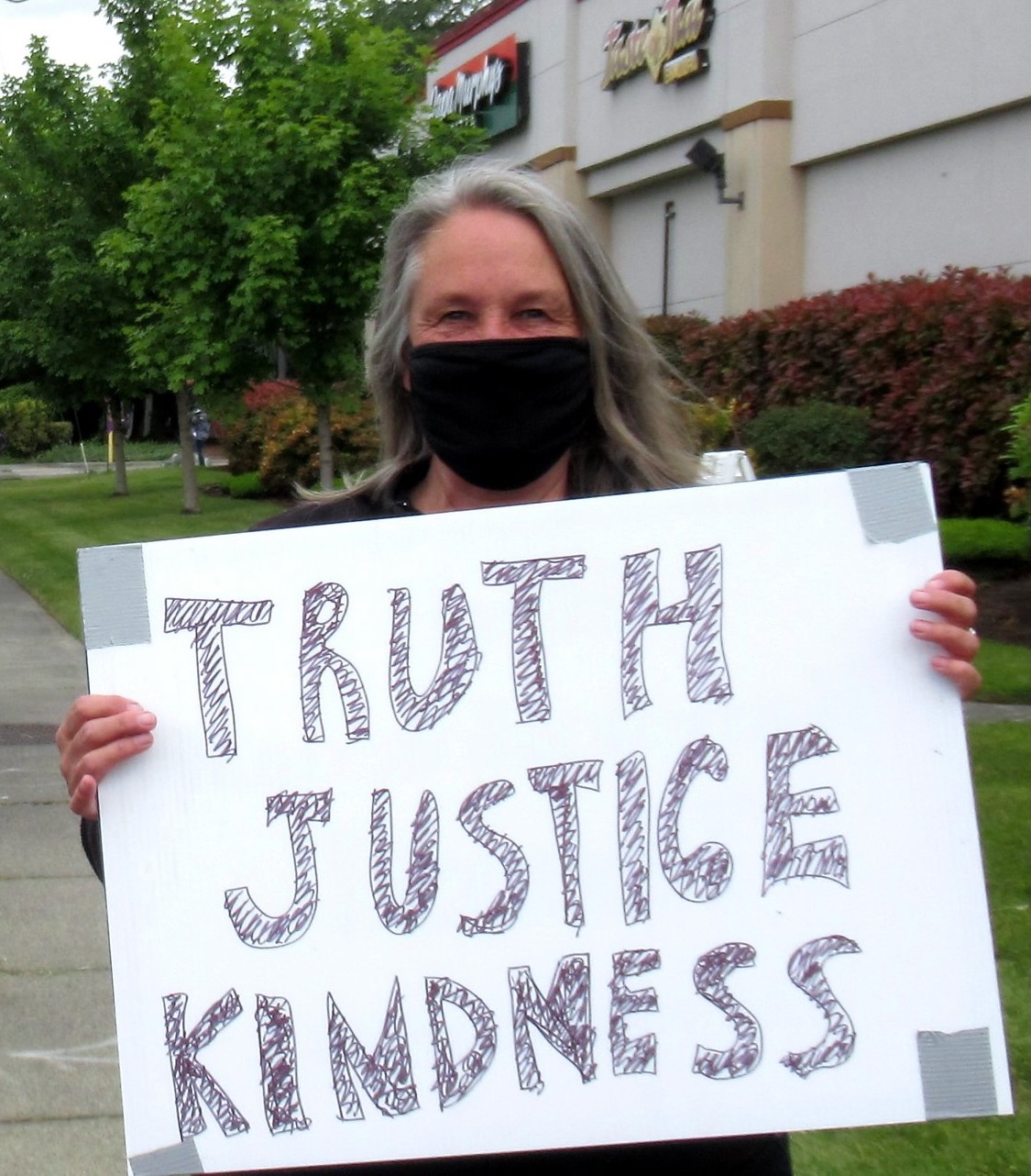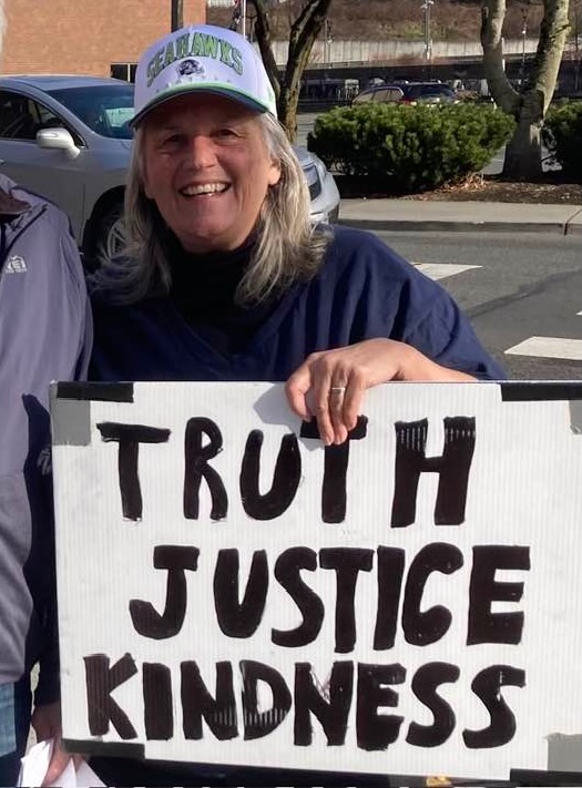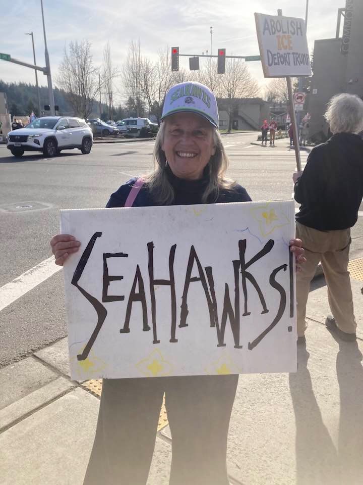 And no, nobody paid me to protest yesterday, and nobody handed me a sign. I’ve been carrying around my own hand-made TRUTH JUSTICE KINDNESS sign since 2020. You’d think TRUTH JUSTICE KINDNESS would be universal values EVERYone could agree with. But weirdly, some people actually give the thumbs down to TRUTH JUSTICE and KINDNESS. (So I made a flip side that says SEAHAWKS on it – and when I get the thumbs down for TRUTH JUSTICE KINDNESS, I flip it to the SEAHAWKS side and usually get a thumbs up and a grin from those people who just thumbs downed the other side.)