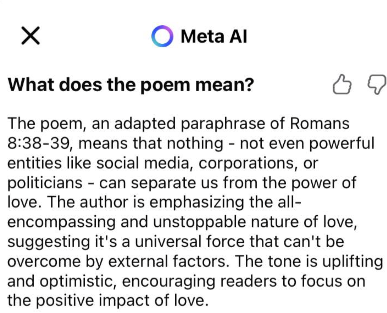 I typed this poem out on my Facebook wall early in the morning, and when I came back to check on it, I found a little box underneath it, with the question: “What does this poem mean?” I was curious what Meta’s AI would have to say about a poem that talks about Meta’s AI. (Which is META by definition.) I found myself laughing out loud when I read when Meta AI had to say about the poem. It was kind of sweet. It actually guessed correctly my intent. It lacked any human ego and took no offense. It was kind of charming. Here’s a screenshot: