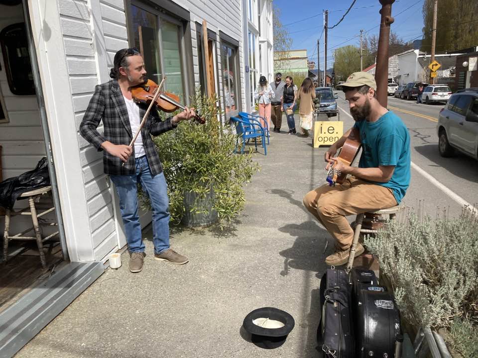 As I was leaving Tweets, I saw that a duo of musicians had set themselves in front of the restaurant and were playing a lively tune with a fiddle and guitar. I found myself grinning. Apple blossoms, birdsong, raspberry pie, a baby, AND live music!