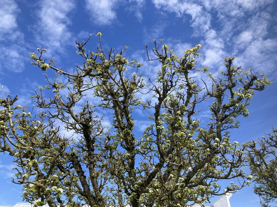 I took my pie out to a picnic table in the little green between Tweets and the Mariposa Restaurant. Oh, my friends, it was so peaceful there. I sat on the bench and listened to the birdsong and watched the sparrows hopping around in the apple blossoms above me.