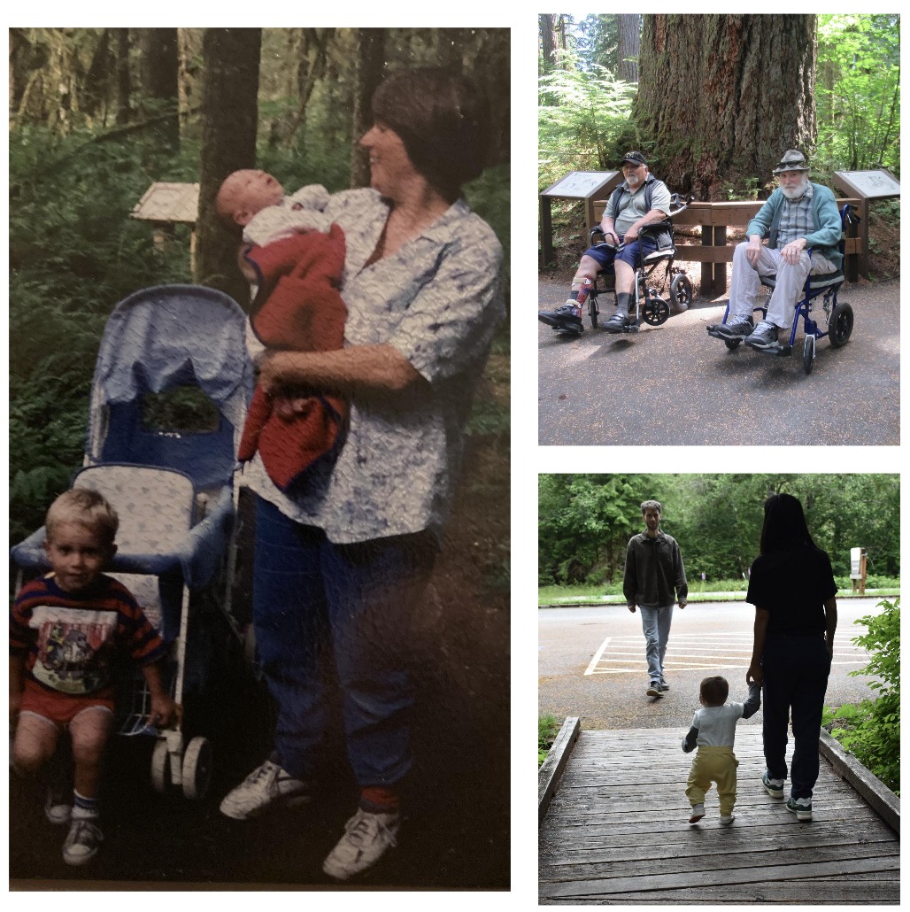 As I drove home from Concrete, I impulsively turned off onto the Baker Lake Road to see what I might see. I ended up at the little Shadow of the Sentinels interpretive trail. This trail holds special memories for me – it was my first hike with my youngest son when he was a week old; when my dad was 100, his care-giver, Gwen, loaded her van with Dad, another man in their adult family home, me, and a couple of wheelchairs and took us all up to the trail because she knew Dad and Joe were in desperate need of a trip to the mountains; and when my granddaughter was not quite one, she’d hiked the trail, too. I was surrounded in sweet memories: Xander trying to focus his new eyes on the trees; Dad pointing to the tops of those trees and checking to make sure I’d gotten a picture of the forest canopy; and my little granddaughter toddling along the boardwalk, holding her mama’s hand, and grinning at her papa who waited for her at the end of the trail – a trail he’d hiked with me when his little brother was just a week old.