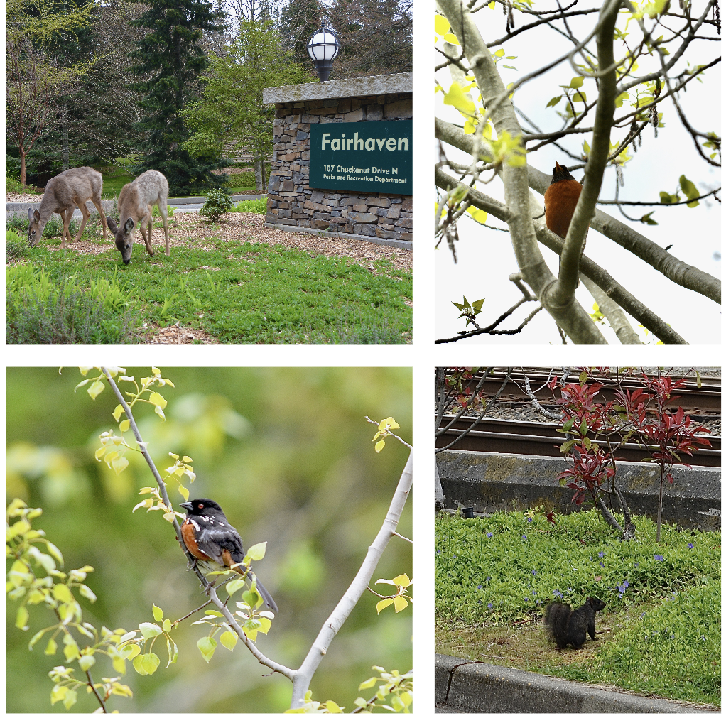 I celebrated Earth Day in Fairhaven today, and it was glorious! My day was filled with green paths, spring blossoms, and happy earthlings – a squirrel, a robin, a towhee, a couple of deer, and some way cool humans.