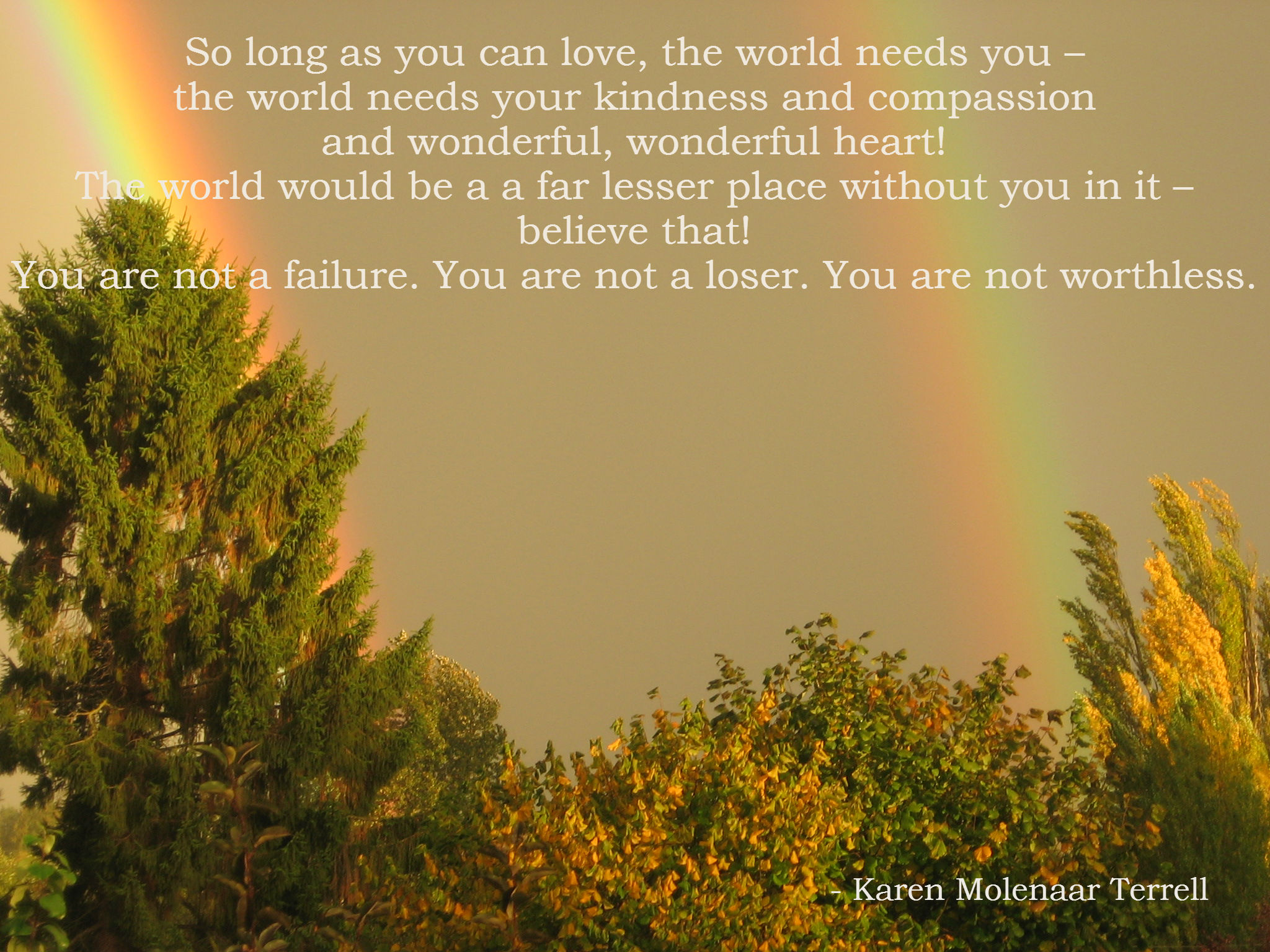 It just doesn’t matter. All the failures, and screw-ups, the petty rivalries, the jealousy, anger, bickerings, and slights, all the nonsense of our lives just doesn’t matter in the grand scheme of things, We’ll learn from all of it, and progress – and that’s all good. And really, the only thing that matters is the love in our lives – the love we express, the love we share, the love we feel.
