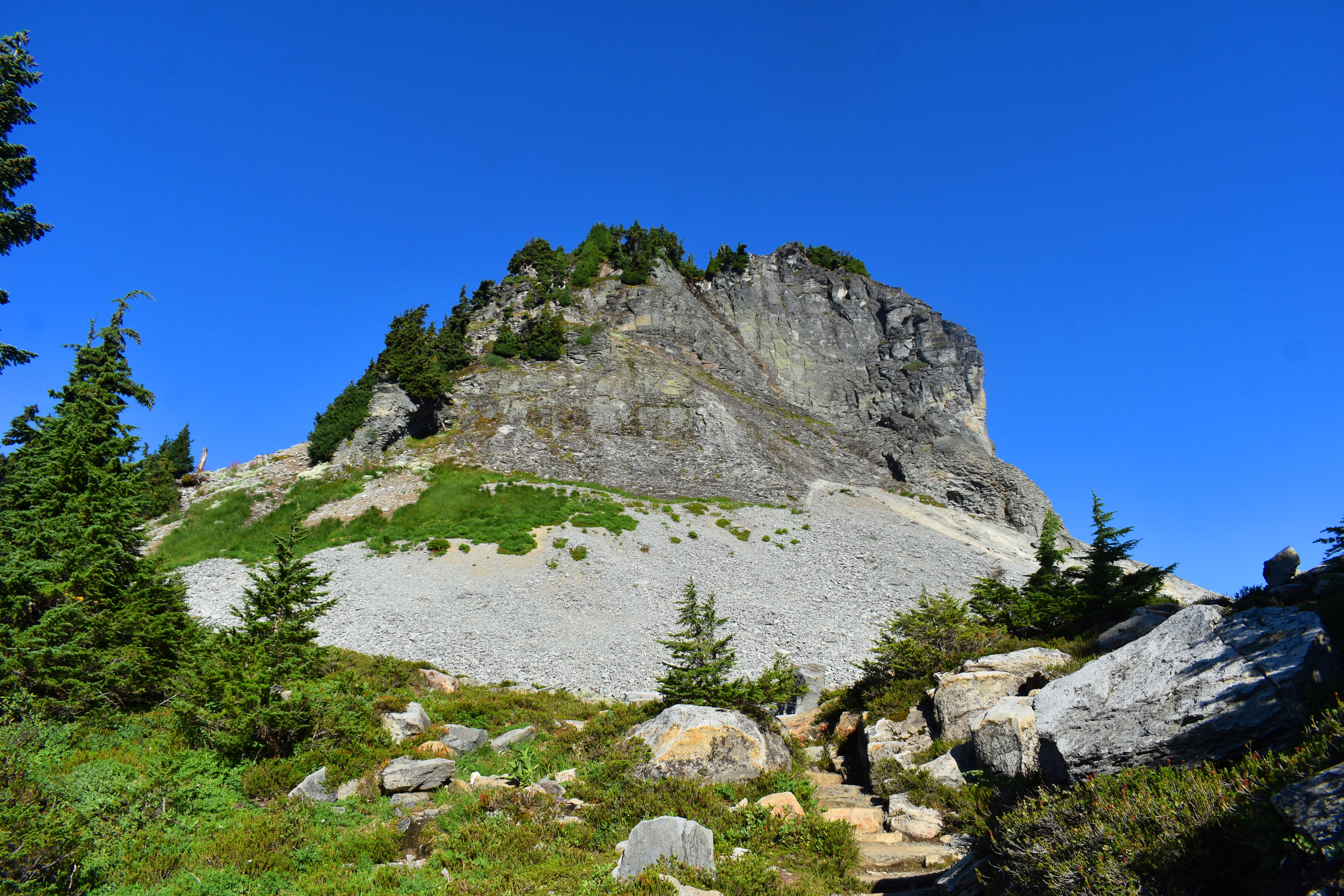 I got up to the trailhead at Artist’s Point pretty early – I’d wanted to avoid the heat of the day. I was probably on the Table Mountain trail by 8:30. I was the only one on the trail when I started out. It was quiet and peaceful up there. Butterflies danced in the wildflowers and a nice fir-scented breeze swirled around me. It felt good to have my shoes on an alpine trail again. I made my way up the side of Table Mountain, stopping now and then to take photos. About mid-way up the side of the mountain there was a step that was a little too big for my 5’3″ self – a step bigger even than that curb I tripped over a year ago. But I found a rock jutting out above the step and hoisted myself up. Take THAT too-high step!