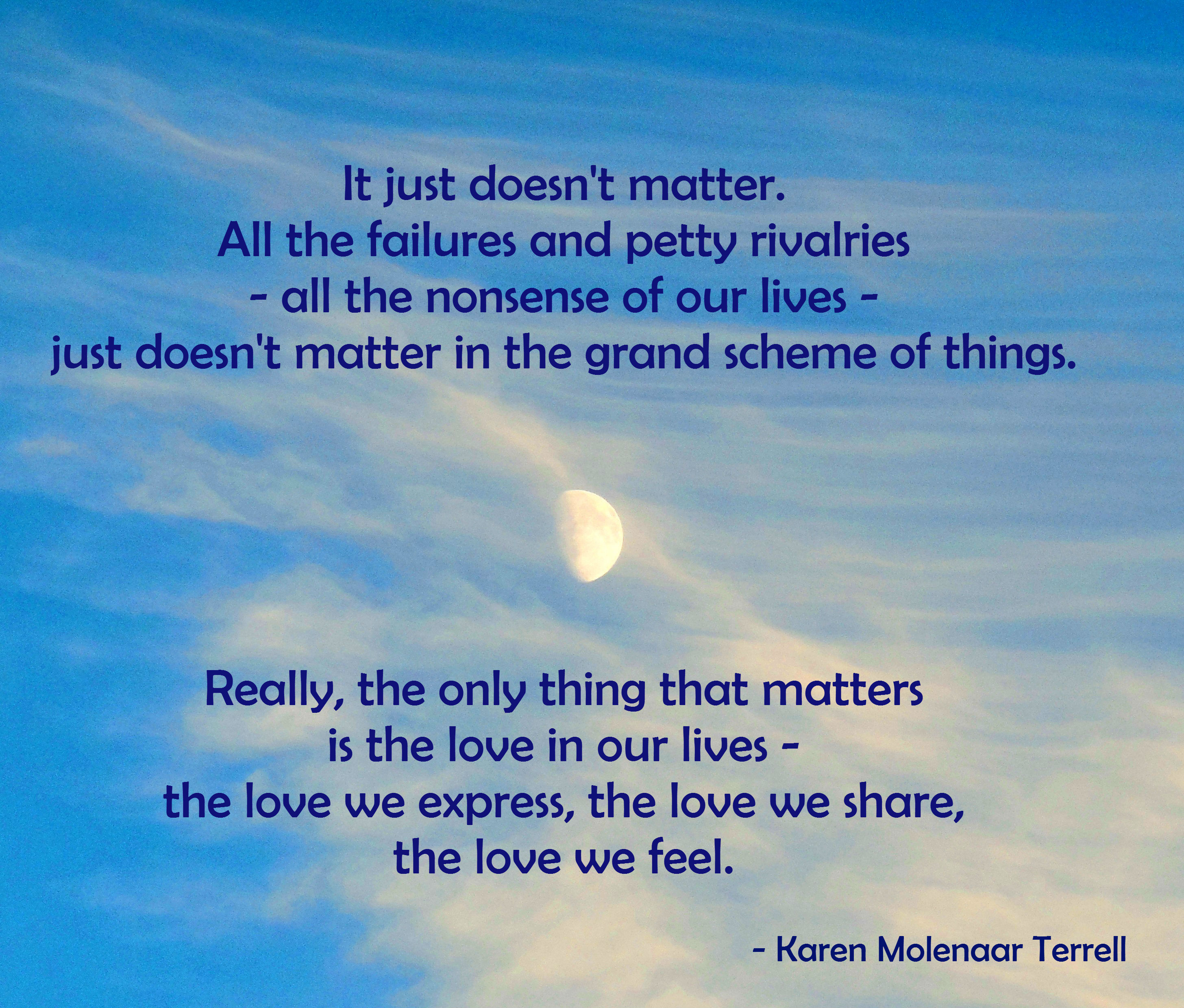 It just doesn’t matter. All the failures, and screw-ups, the petty rivalries, the jealousy, anger, bickerings, and slights, all the nonsense of our lives just doesn’t matter in the grand scheme of things, We’ll learn from all of it, and progress – and that’s all good. And really, the only thing that matters is the love in our lives – the love we express, the love we share, the love we feel.