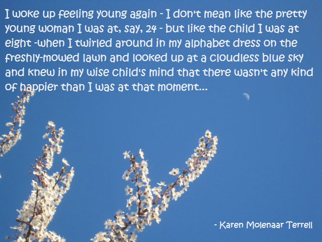 There’s this great line from Jurassic Park (Michael Crichton) : “Life will find a way.” That’s what Spring feels like to me – like Life is just bursting out all around me, breaking through the winter, clothing the trees with new leaves, unfolding in the blossoms – and bursting out of me, too. There is renewal here. Nothing can stop it. Life is finding its way.