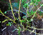 Months went by, the house remained uninhabited, and one day I noticed everything on the side of the road had been shaved off – including the rose bush. I could no longer find even a stubble of it. And then signs of a construction project began to appear there – heavy equipment and gravel and vegetation rolled flat. I kept an eye out for the rose bush – but could find no trace of it. I’d just about given up hope of ever seeing it again when, a few days after the heavy equipment arrived, I finally saw a twig with a rose leaf hanging from it sprouting out of the mashed-up blackberry vines and grass. I quickly scooted home, returned to the rose bush with a bucket and shovel, and dug her up.