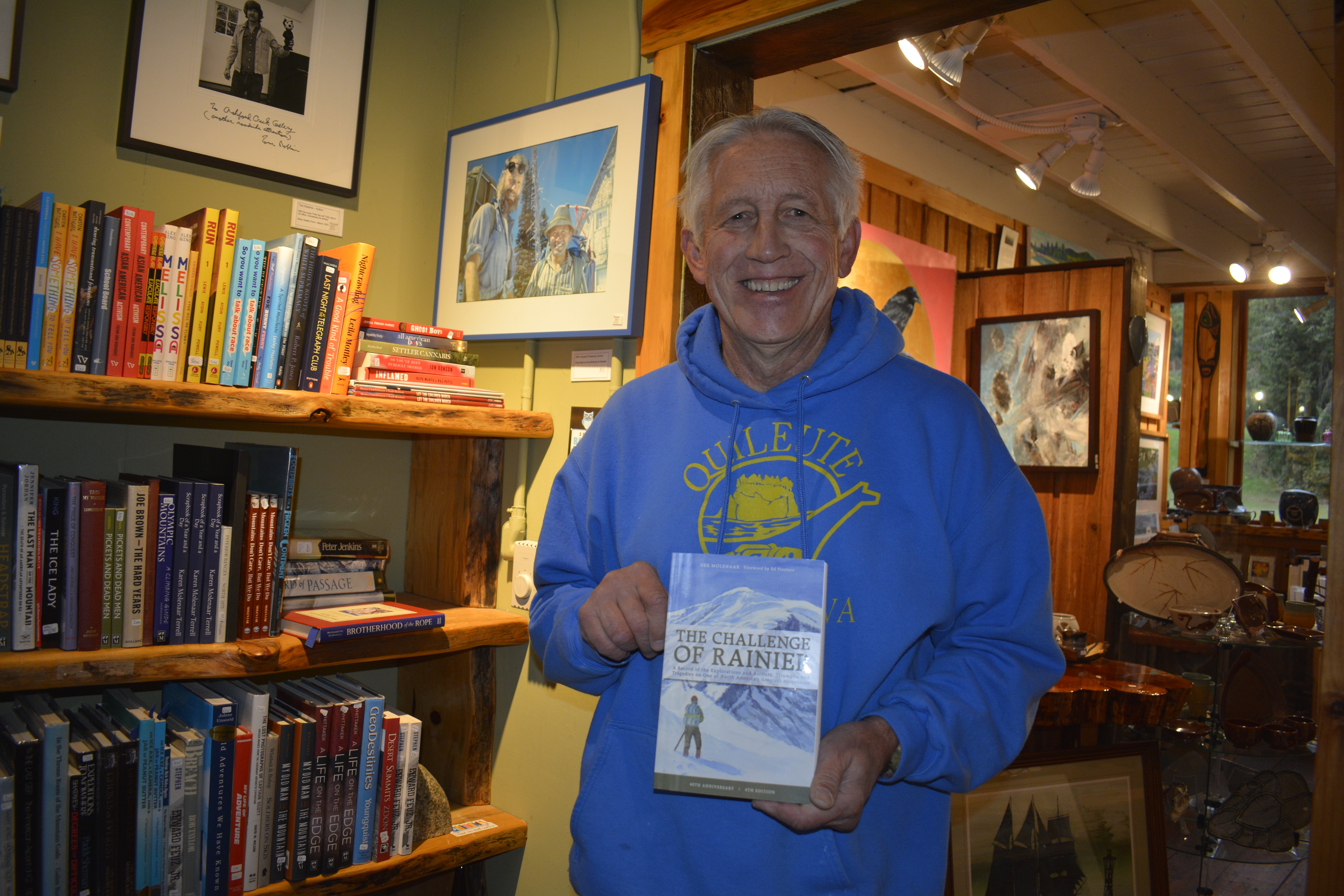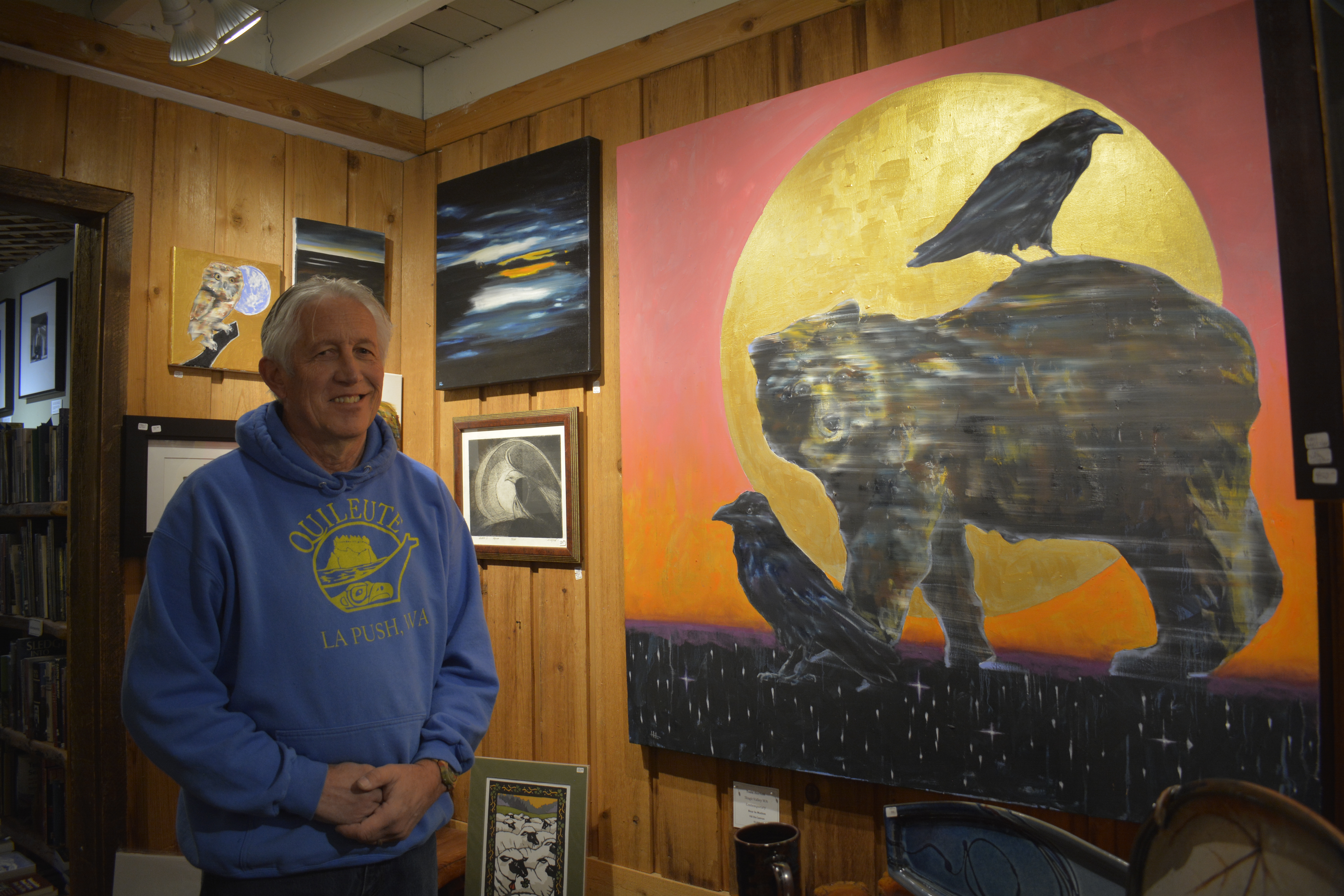 We visited the Ashford Creek Pottery shop on the way up to Rainier yesterday to visit its proprietor, our old friend Rick Johnson, and to take pictures of the artwork of Dad’s that Rick has hanging on the walls. I also got Rick to pose with art by Todd Horton (who, coincidentally, lives in the same Skagit Valley communicty as us), and to pose with one of Dad’s books.